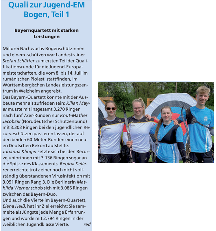 Quali zur Jugend-EMBogen, Teil 1 Posted on Mai 29, 2024Mai 29, 2024 by Klaus RupprechtHier ein Bericht kopiert aus der Bayerischen Sportschützenzeitung von der Jugend EM Quali mit Elena Heiß.